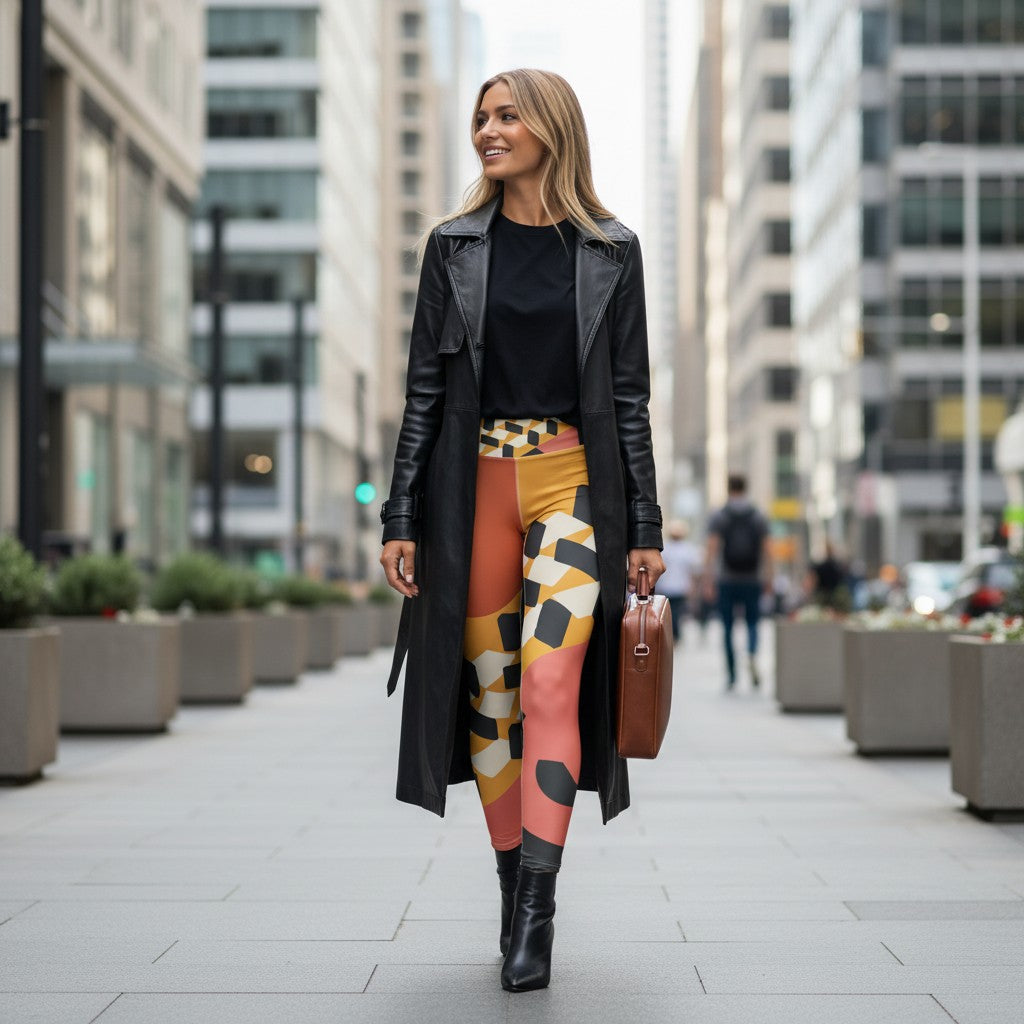 Where retro rhythm meets modern stretch, these leggings turn every step into a design statement. Bold geometric lines and sunset tones channel that timeless, wear-it-anywhere energy your wardrobe has been craving. High-waisted, sculpting, and endlessly comfortable, they move like a second skin with first-class confidence. Slip them on and let your outfit speak fluent throwback with a future-forward stride.